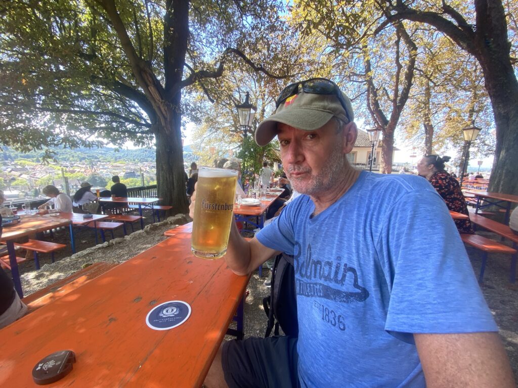 We were nearly down the bottom when we heard interesting music and found a beer garden overlooking the city. It was perfect – we were thirsty and hungry. A beer and a varied schnitzel salad went down very well.