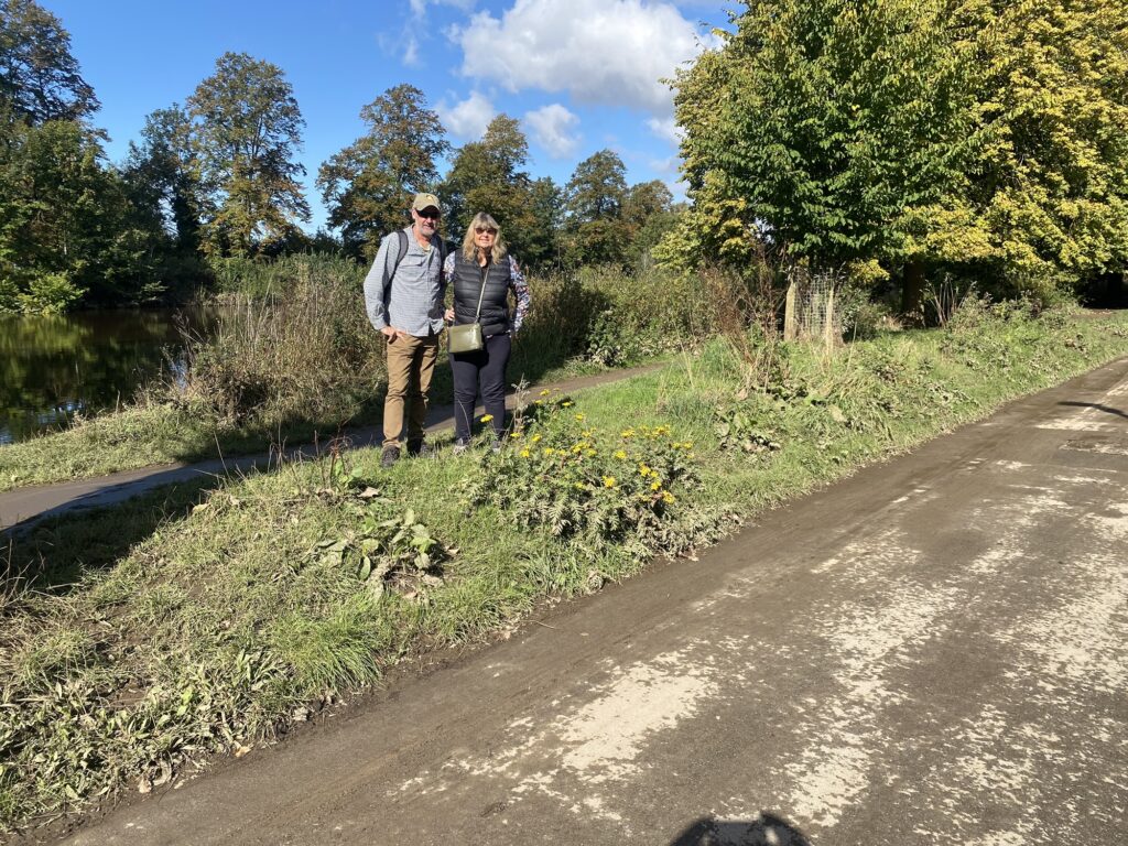 Once all showered and breakfasted we started the walk into town. We checked the river route first- and amazingly the river had abated and we could now walk along the path. However it was a little muddy! I had a big skid initially but stayed on my feet. Here’s us cleaning our shoes on the grass in front of a muddy section.
