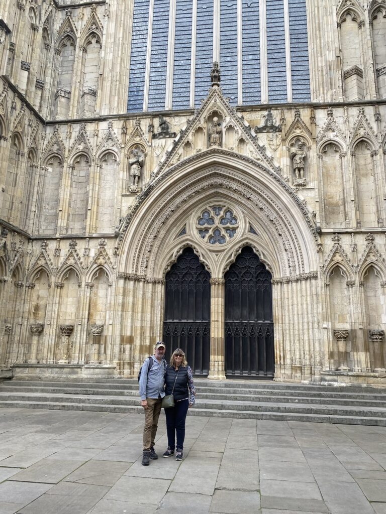 We went into the busy streets – there is a food festival on this week so it was especially busy. We found the huge York Minster. It’s hard to get a photo of us and the minster with the correct scale – you can choose from these below.